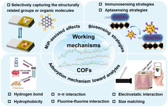食品安全关乎公众健康和经济可持续发展,食品安全问题中常涉及到的污染物包括抗生素、农药、重金属离子、真菌毒素、有机污染物、食源性细菌等。开发先进的检测技术,对食品或环境中存在的这类污染物进行精准、灵敏的识别,具有至关重要的意义。该综述总结了基于共价有机框架材料(COFs)在复杂环境与食品基质中检测食品污染物的最新研究进展与现状。详细探讨了COFs基纳米材料的结构特征与分类,阐明了COFs的结构设计与其传感性能之间的关系。此外,分析了利用COFs相关传感器检测食品污染物的吸附机制与生物传感机制,并对多种检测技术进行了总结。该综述指出了食物污染物检测面临的挑战并展望了未来发展方向,为研究人员提供了一条从分子设计到实际应用的清晰路径。为开发下一代精准靶向型COFs基传感器、提升食品安全监测水平提供助力。
