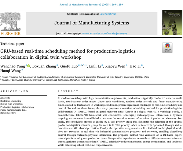 李浩教授团队在智能制造领域国际权威学术期刊《Journal of Manufacturing Systems》(中科院一区TOP,影响因子14.2)发表题名为“GRU-based real-time scheduling method for production-logistics collaboration in digital twin workshop”(数字孪生车间下基于GRU的生产-物流协同实时调度方法)的高水平研究论文。机电工程抽奖轮盘