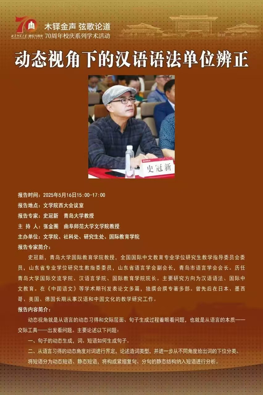 上一条:70周年校庆系列学术报告|基于眼动追踪技术的语言加工研... 下一条:70周年校庆系列学术报告|《诗经》与“诗教”