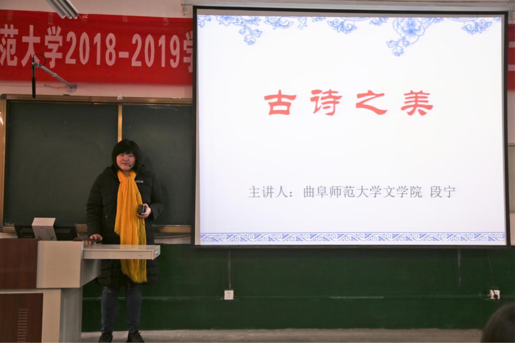 段宁自魏晋南北朝时期的《西洲曲》,贯穿沈德潜的《古诗源》、李商隐的《无题》,从诗的意境入手,层层剖析诗词,简入深出地讲明了诗词中诸如蝉联、顶真、谐音双关语等的诗词手法的运用及修辞效果。她强调,要学会探索古诗词之美,积学以明诗歌本意,细读以感诗歌之美,借鉴相关文艺评论,知人论世,学会自我探索和学习。