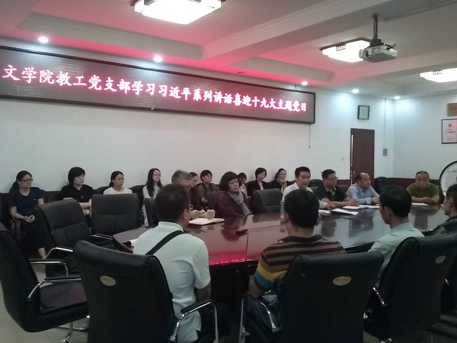 任明华在会上传达了校党委关于开展“喜迎十九大 党员当先锋”主题党日活动的通知,要求全体党员认真学习习近平总书记系列重要讲话精神和廖俊波、黄大年同志先进事迹,收看《辉煌中国》、《巡视利剑》等专题教育片,积极开展关于先锋党员、合格党员以及不合格党员具体表现的讨论。