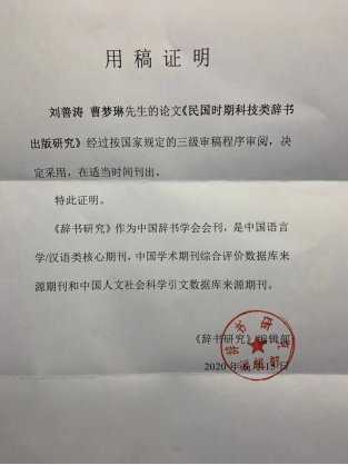 近日,抽奖轮盘 2017级汉语言文学专业本科生曹梦琳以第二作者撰写的论文《民国时期科技类辞书出版研究》成功被中国语言学/汉语类核心期刊《辞书研究》采用。