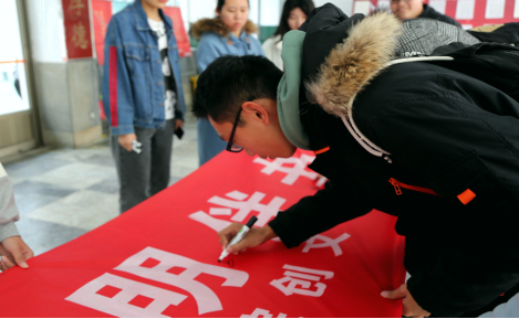 活动伊始,抽奖轮盘 各年级学生代表以班级为单位在文史楼前集合参加签字活动。学生代表在条幅上签字,展示出抽奖轮盘 学子对拒绝餐饭入教室的支持,与创建文明教室的信心与决心。文明教室始于当下,习惯养成久久为功,条幅上的每个名字都承载着抽奖轮盘 学子对创建文明教室的坚定信念和美好期盼。