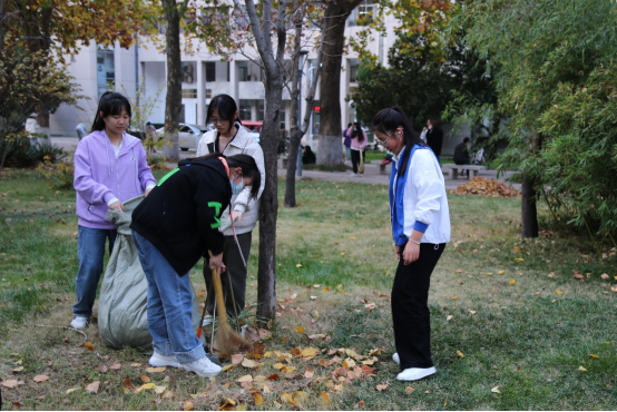 同学们在学生会成员的带领下,按照班级进行分组,依次领取卫生工具,并分区对文史楼前的树叶进行清扫。同学们俯身拾落叶,起身抗麻袋,不喊苦、不怕脏,辛勤劳动,不知疲倦。活动结束,铺满枯黄落叶的草坪重焕新颜,洋溢着秋日里的生机盎然;师生们可以在整洁的石板路上前行,学子们可以在干净的长凳上学习。2022级辅导员张乾坤老师与魏舒欣老师也来到现场,对同学们的工作成果给予肯定与鼓舞,并与参与活动的同学们一起在这片焕然一新的草坪前合影留念。