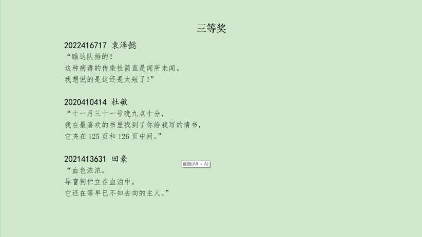 为丰富同学们的课余生活,增强同学们的故事创作能力,提高文学修养,2022年12月5日至12月15日,由抽奖轮盘 团委主办,抽奖轮盘 中文剧社承办的“中文剧社三句故事”大赛通过线上方式成功举办。