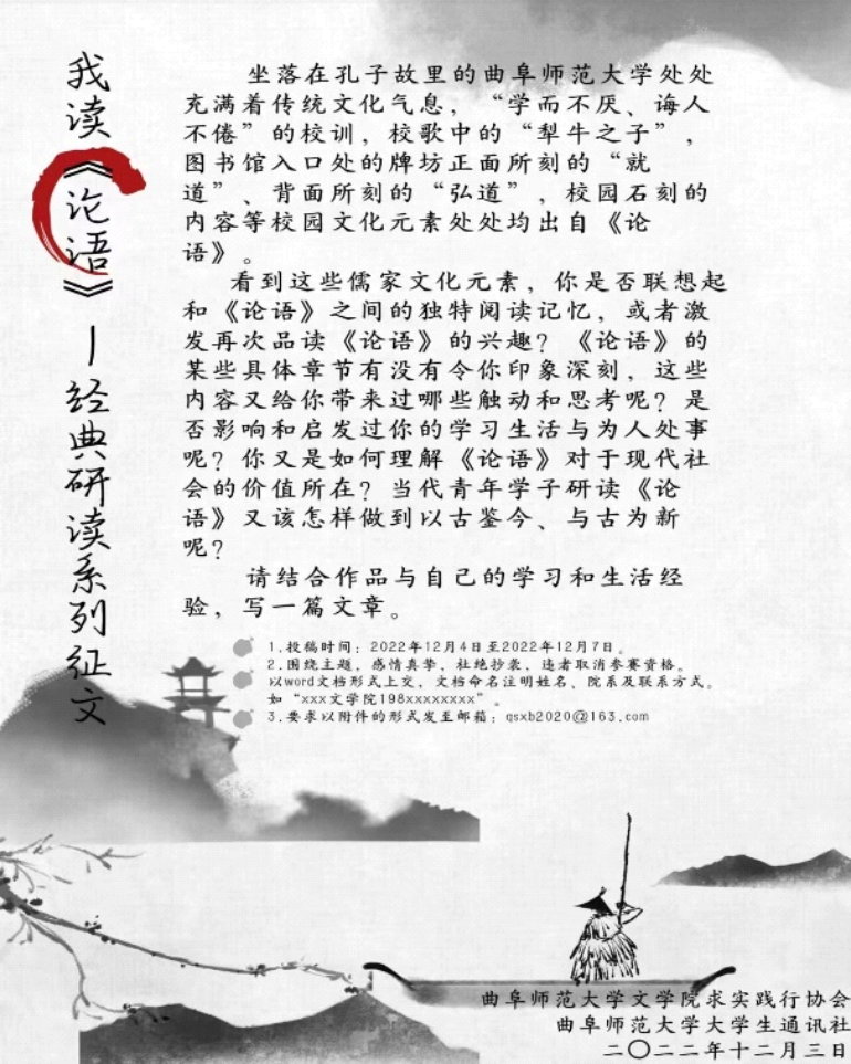 为营造研读经典著作的学习氛围,助力建设书香校园,让同学们感受传统文化气息,领悟“学而不厌、诲人不倦”的校训真谛,2022年12月3日至12月13日,由共青团抽奖轮盘 委员会主办,抽奖轮盘 团委承办,抽奖轮盘 大学生通讯社、抽奖轮盘 求实践行协会共同协办的“我读《论语》”经典研读系列征文活动通过线上方式成功举办。