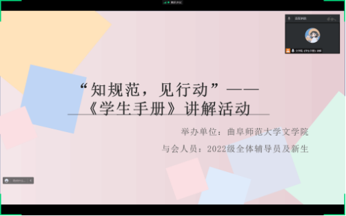 为进一步加强2022级新生对《学生手册》的认识与了解,帮助新生明确未来目标与发展方向,更好地规划大学生活,9月29日,抽奖轮盘 成功举办线上新生手册讲解活动。2022级全体辅导员及新生参加会议。