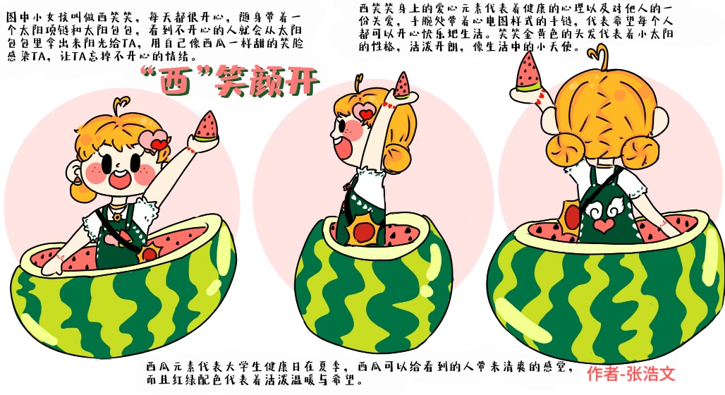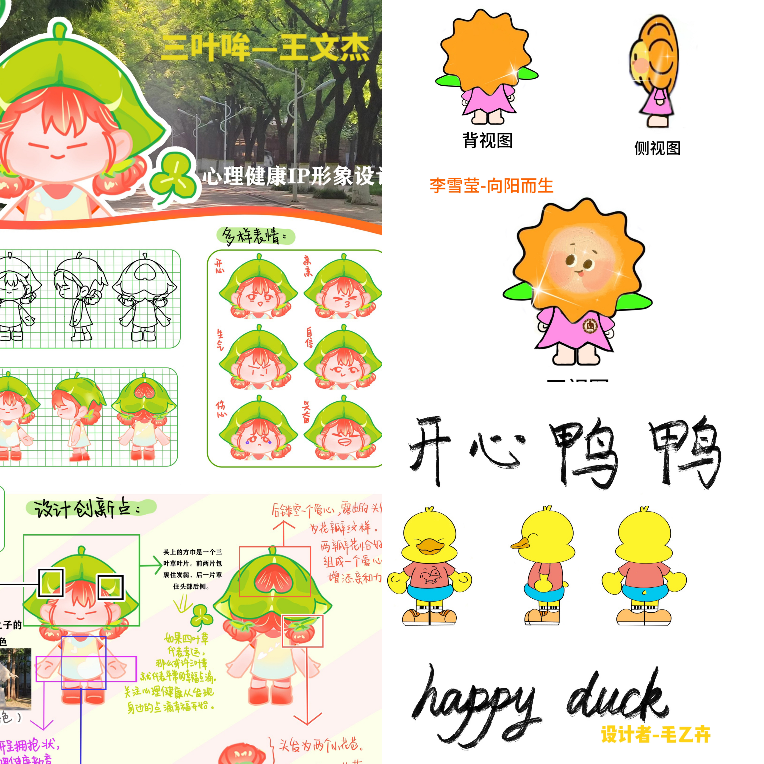 活动前期,心理健康部干事组织同学们填写报名表并在活动群中为他们答疑解惑,鼓励同学们踊跃参加,活动气氛高涨,同学们充满了激情与活力。活动过程中,同学们根据主题,结合自身的理解并发挥想象,设计出独特的IP形象,呈现出一场视觉与创意的盛宴。在作品中,他们或善于从生活中汲取灵感,将平凡的事物赋予新的生命,如“西”笑颜开,其中红绿配色的西瓜元素代表着活泼与希望,不仅给人带来清爽的感觉,还代表着夏日的大学生健康日;或运用丰富的色彩,勾勒出一个个生动新颖的形象,如开心鸭鸭,明亮的色彩搭配充满希望与活力,每一个欢快的表情都极具有感染力。