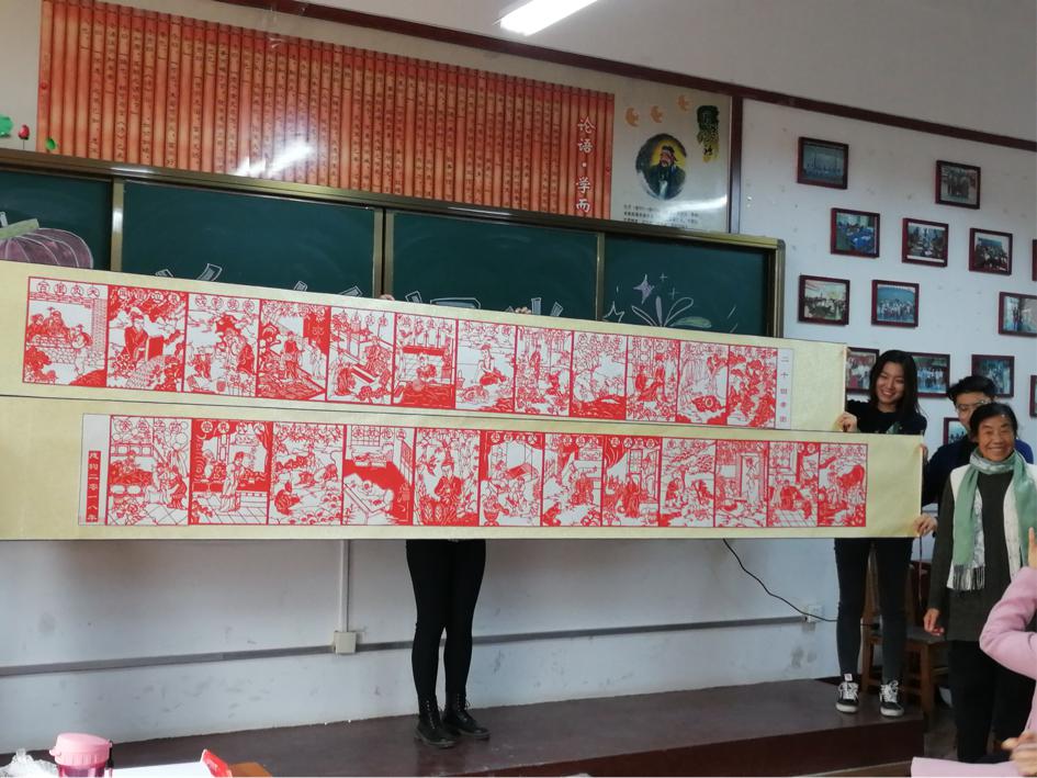上课前, 冯老师给同学们展示了历时两个月完成的《二十四孝图》,此作品曾作为曲阜孝文化节展示作品,二十四张生动鲜活的剪纸作品细腻又壮观,使在场同学赞叹不已。