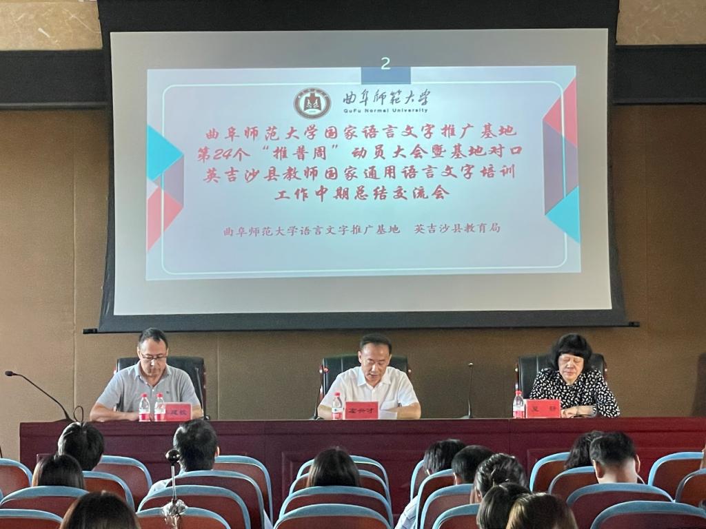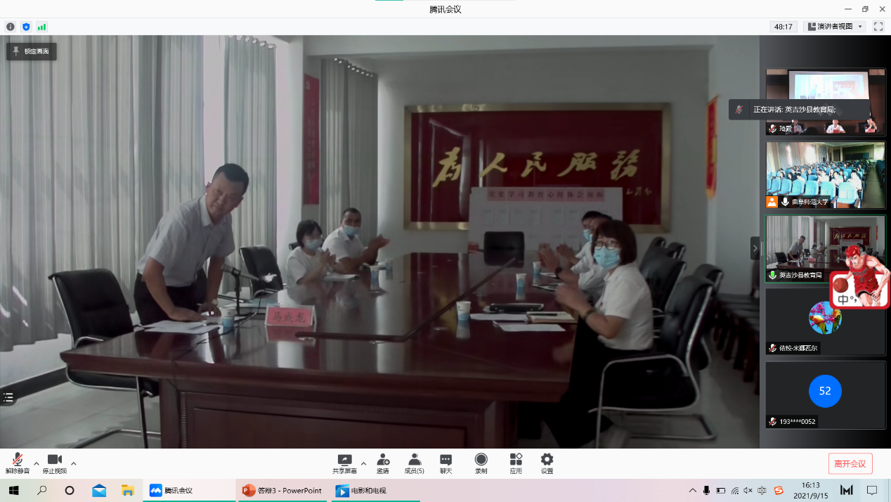2021年9月15日下午16时,抽奖轮盘 国家语言文字推广基地第24个“推普周”动员大会暨对口英吉沙县教师国家通用语言文字培训工作中期交流会正式开始。此次会议线上线下同时举行,线上会议通过腾讯会议连线英吉沙县教育局,线下会议在抽奖轮盘 509举行。出席此次会议的领导老师有抽奖轮盘 党委书记左兴才,国家语言文字推广基地——抽奖轮盘 语言文字推广基地主任、抽奖轮盘 院长夏静,抽奖轮盘 语言文字推广基地副主任李建校,英吉沙县教育局党组副书记、局长马成龙,英吉沙县教育局推普办主任徐玉霞,英吉沙县中小学及幼儿园书记、校(园)长、教师代表,语言文字推广基地教师、助教。