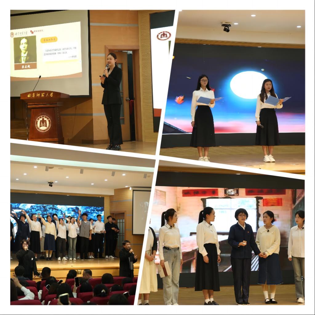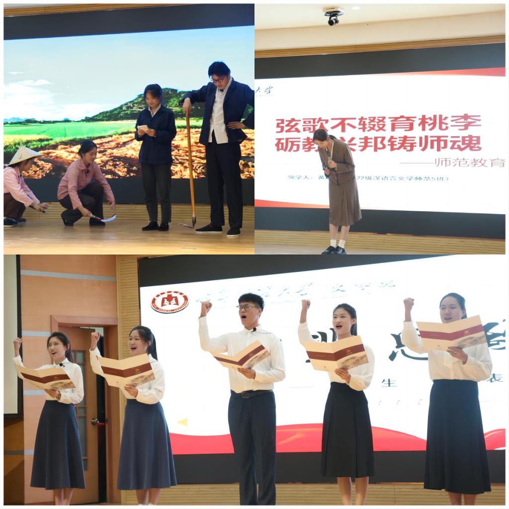 “弦歌不辍育桃李,砺教兴邦铸师魂。”在朋辈思政课板块中,领学人黄静雯同学从何为教育家、何为教育家精神、如何践行教育家精神等方面出发,与同学们共同学习教师典范,感受师者情怀。“躬耕教坛守初心,潜心育人铸师魂。”中国教师博物馆大学生师德宣讲团带来朗诵《躬耕教坛,强国有我》,生动表达了新时代教师用仁爱铸师魂,以每一个不平凡的“我”,构成了伟大的中国。话剧《乡村教育破晓者—陶行知》向同学们展现了伟大的人民教育家陶行知先生“捧出一颗丹心,献与亿兆生灵。”的“知行合一”精神。