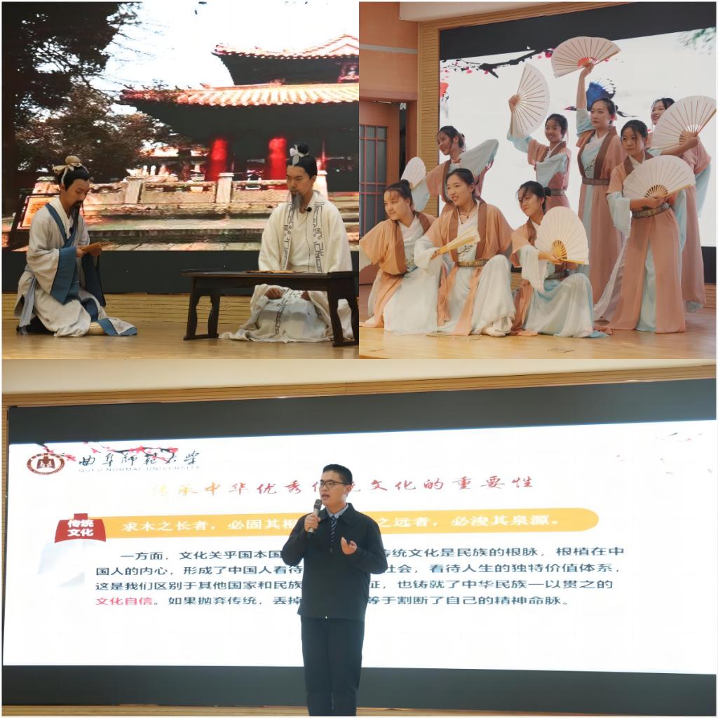 “赓续千年文脉,星耀复兴之路。”在传统文化板块中,领学人隋佳坤同学从传承中华优秀传统文化的重要性、抽奖轮盘 对传统文化传承与弘扬的贡献、文化自信与中华民族伟大复兴等三方面带领同学们一起学习优秀传统文化。“三人行,必有我师焉。”中文剧社为同学们带来了话剧《我师》,讲述了孔子及其弟子的教育故事,深刻诠释了在人类历史发展的长河中,教师担任着承前启后、继往开来的光荣使命。《纸扇书生》以舞蹈的形式向同学们展现了“春华秋实路漫漫,一瓣心香巧耕耘。”