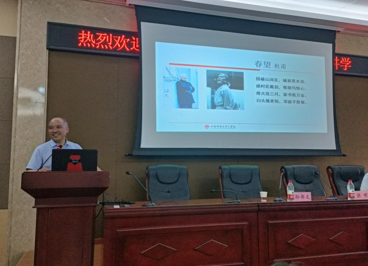 报告中,孙教授指出“修辞立其诚”是富有中国特色的一个文论命题,并围绕“什么是好的文学?”“好的文学是如何创作出来的?”“好的文学能给我们带来什么?”展开了论述。董强在《波德莱尔传·中译本序》说:“波德莱尔的诗歌,具有一种人与世界初次交锋时激发出的全部个人意识的强度,是个人在人生某个意想不到的时刻获得某种经验之后突然瞥见的自生至死的人生全貌,是个体在走出自己身体的躯壳而遇上世界的躯壳时灵魂的震颤与肌肤的战栗。”孙教授以此为例,认为波德莱尔的诗歌就是“诚”之作,阐释了“修辞立其诚”在文学创作中的价值和意义。在分析杜甫《春望》、洛夫《春望》和痖弦《山神庙》时,他认为想象情景,逐个解读不懂处,方能读懂诗。而好诗呢,又往往体现着大自然万事万物的圆融状态。他认为中华传统文化讲求“诚”,“诚心”是沟通人道和天道的桥梁,并以《论语》《中庸》等传统经典对其进行了丰富、深入的论述,强调汲取中国传统文化的精华以推动中华民族伟大复兴的中国梦的实现。
