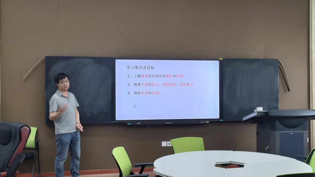 来自现代汉语教研室的邓勇老师讲授了《现代汉语介词》,他从现代汉语虚词入手,结合其与实词的区别,讲述了现代汉语介词的定义、语法功能、语法意义等相关内容,并进一步分析了动词和介词的区别及二者之间的联系。整个教学过程条理清楚,内容呈现具有清晰的逻辑层次,循序渐进。