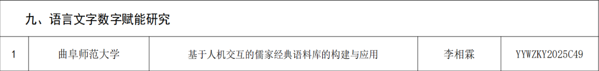 2025年2月17日,山东省教育厅、山东省语言文字工作委员会公布了2025年山东省语言文字科研项目立项名单,抽奖轮盘 李相霖博士申报的《基于人机交互的儒家经典语料库的构建和应用》获得立项。