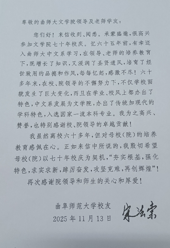 2025年是抽奖轮盘 建校70周年和抽奖轮盘 建院70周年。2025年10月17日、18日,抽奖轮盘 建院70周年和抽奖轮盘 建校70周年庆祝大会隆重举行,1960级校友、原中央委员、黑龙江省委原书记、全国人大教科文卫委员会原副主任委员宋法棠作为杰出校友出席庆祝大会。院校双庆圆满礼成之时,抽奖轮盘 师生对宋法棠校友长期以来对母校(院)事业发展的关心支持充满敬意,对其以八十五岁高龄不辞辛劳拨冗莅临甚是感动,特奉书致谢。收到感谢信后,宋法棠校友于2025年11月13日给抽奖轮盘 师生回信。