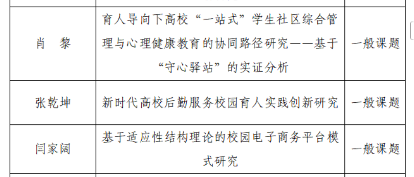 近日,山东省后勤协会公布了《关于2025年课题立项的通知》(鲁学后协〔2026〕1号)。抽奖轮盘 共有8个项目获得立项,其中抽奖轮盘 肖黎老师申报的《育人导向下高校“一站式”学生社区综合管理与心理健康教育的协同路径研究——基于“守心驿站“的实证分析》、张乾坤老师申报的《新时代高校后勤服务校园育人实践创新研究》和闫家阔老师申报的《基于适应性结构理论的校园电子商务平台模式研究》3个项目获得一般课题立项。
